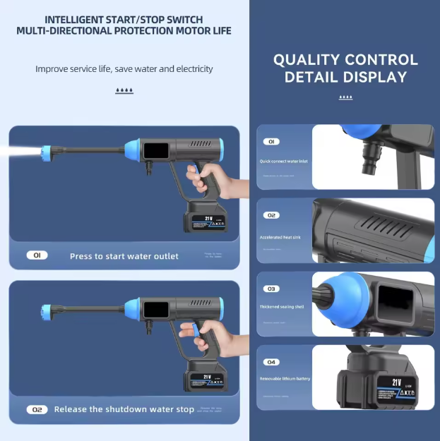Le nettoyeur de pistolet à eau électrique haute pression sans fil offre une solution de lavage polyvalente pour votre voiture, votre maison et bien plus encore. Doté d'une pression de fonctionnement de 30 bars, ce nettoyeur puissant vous permet de nettoyer efficacement une variété de surfaces, que ce soit pour laver votre voiture, nettoyer vos extérieurs ou même arroser votre jardin.
